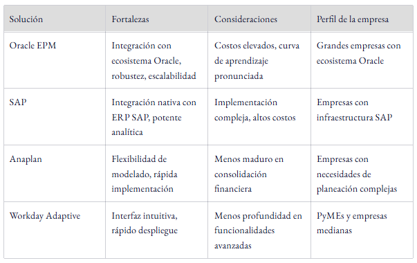 Según Gartner (2024), el mercado de EPM está liderado por varias soluciones, siendo Oracle EPM una de las destacadas por su capacidad de ejecución y visión integral, aunque no la única opción relevante.