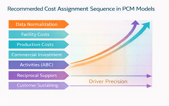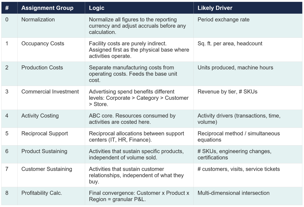 The assignment sequence (allocation waterfall) is not arbitrary. It follows a causal-cascade logic in which each assignment group eliminates a source of ambiguity before passing it on to the next. A cost should never be assigned to a customer that has not yet been properly costed upstream.