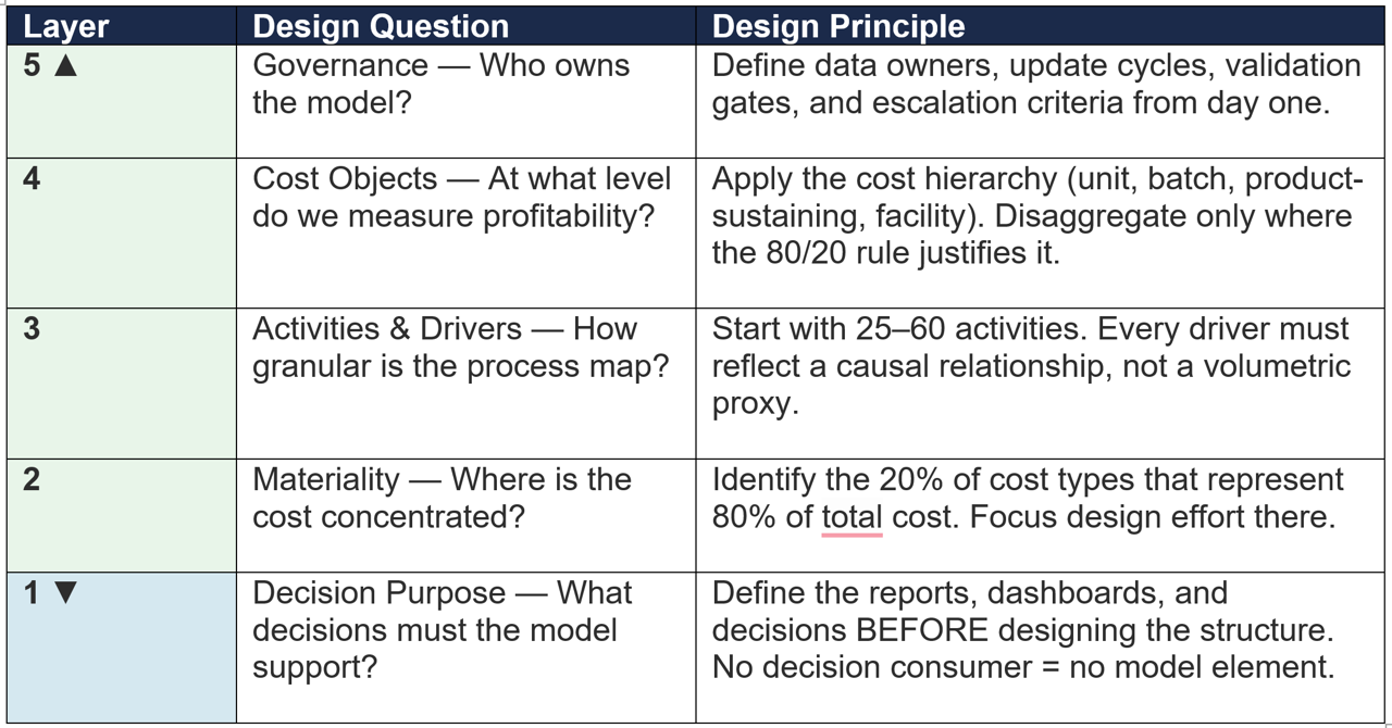 The pyramid reads bottom-up: decision purpose is the foundation. Every design choice above it must be traceable to a specific decision that the model enables. If an activity, driver, or cost object cannot be linked to a decision consumer, it should not exist in the model.