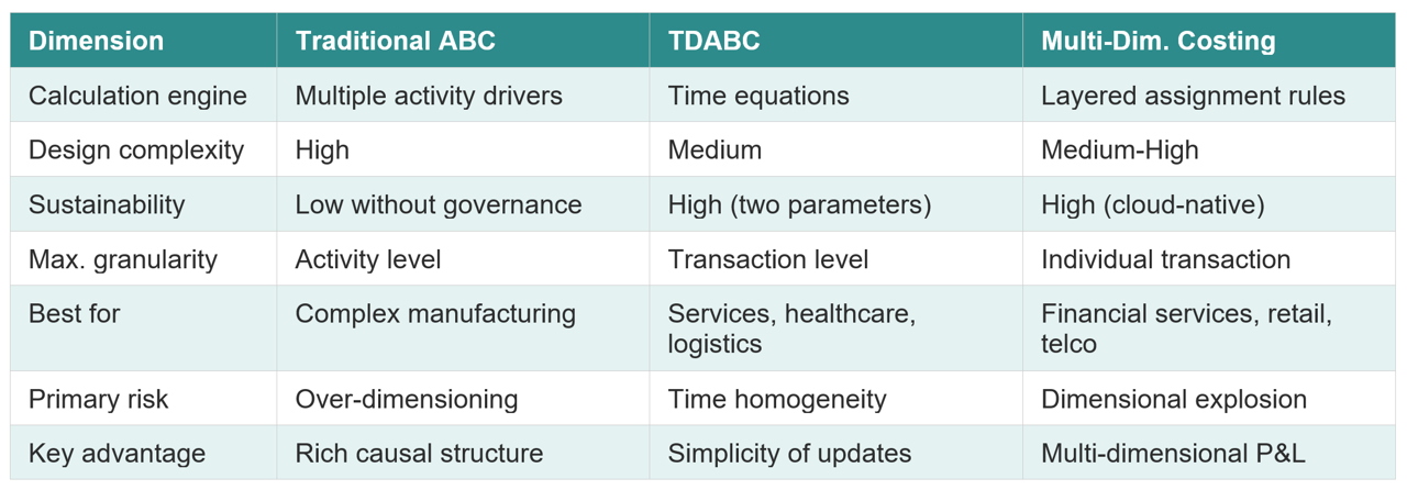 Practical note: In real-world implementations, the most successful models combine elements of all three approaches. A well-designed PCM model can use ABC logic for indirect costs, time equations for shared service centers, and direct transactional assignment for direct costs. Methodological purity is less important than causality and sustainability.