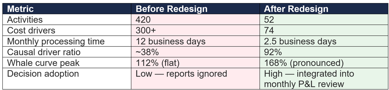 The redesigned model reduced activities by 88% and drivers by 75%, yet produced a whale curve with 50% greater visibility into profit concentration. The critical insight was not that the bank needed fewer numbers — it needed better-designed numbers. Processing time dropped by approximately 80%, enabling the finance team to deliver results within the first week of each month, which was the operational threshold required for the outputs to influence branch-level decisions.