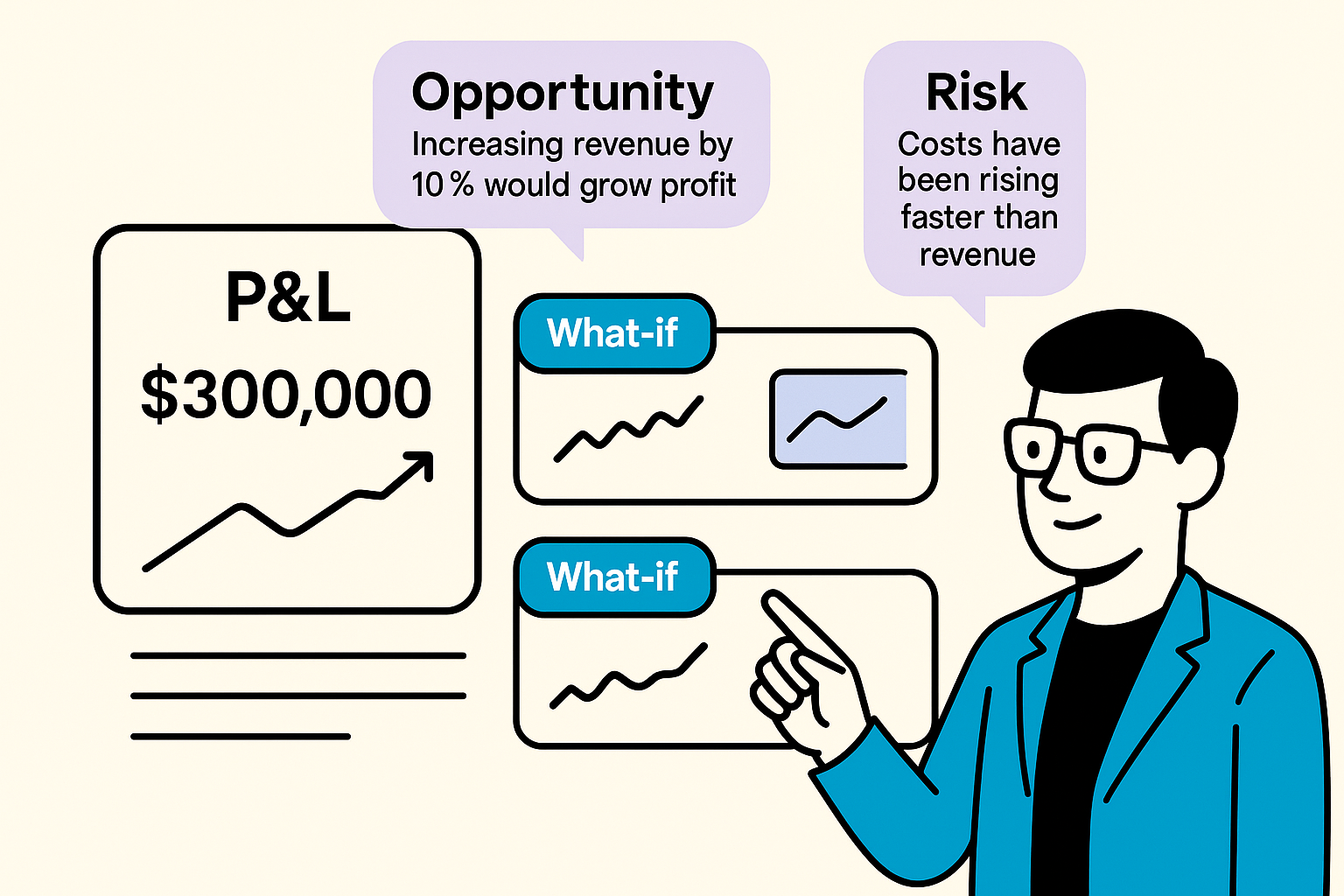 Visualiza el impacto financiero de tus decisiones en tiempo real. Los copilotos generan escenarios, narrativas y dashboards que explican “el por qué” detrás de cada dato, directamente conectado a tu cuenta de resultados.